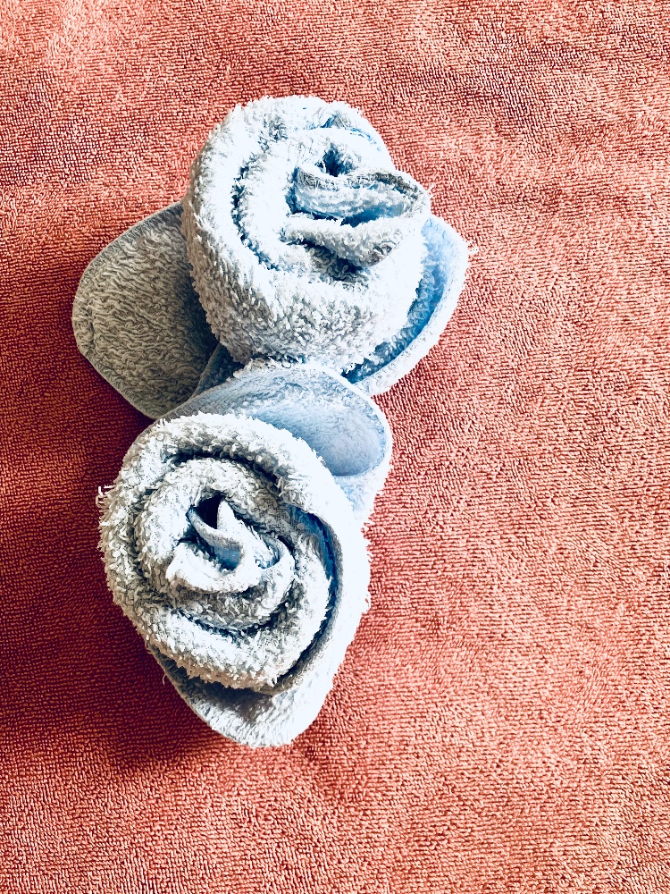 こんにちはミドルエイジ〜シニアメンズの方のリカバリールームです。あなたが心と体の曲がり角を感じ始めたらリカバリーをオススメいたします。それはいつまでも健康でカッコいい人でいてほしいから!お客様用のお手ふきで薔薇を作ってみました。今日も栄養あげて咲かせてみせましょう!